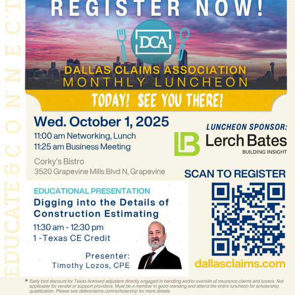 If you are interested in presenting a TX approved CE course at an upcoming meeting, please review the chart below for any open slots. Then contact DCA VP Education at education@dallasclaims.com\
